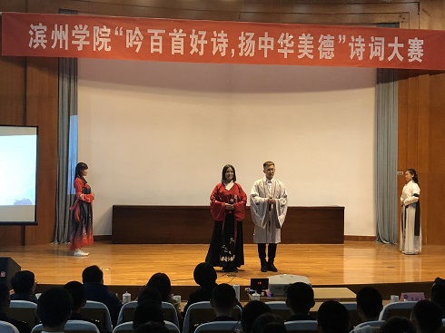 12月13日,外国语学院2018级学生代表苗向阳、刘梦薇、张欣颖、吴慧翔代表我院于学苑会堂第二报告厅参加滨州学院“吟百首好诗,扬中华美德”诗词大赛。