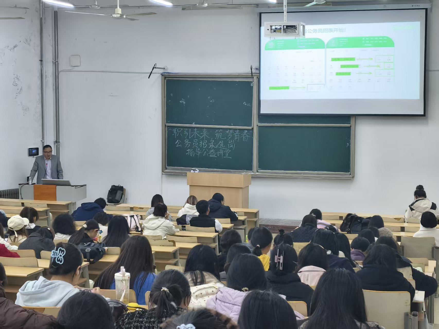 为助力有志于公职事业的学子精准把握考录政策、科学规划职业路径,11月7日,外国语学院邀请成公教育资深工作人员开展“职引未来·筑梦青春”公务员招录选岗指导公益讲堂,2026届部分毕业生和2027届全体毕业生参加。
