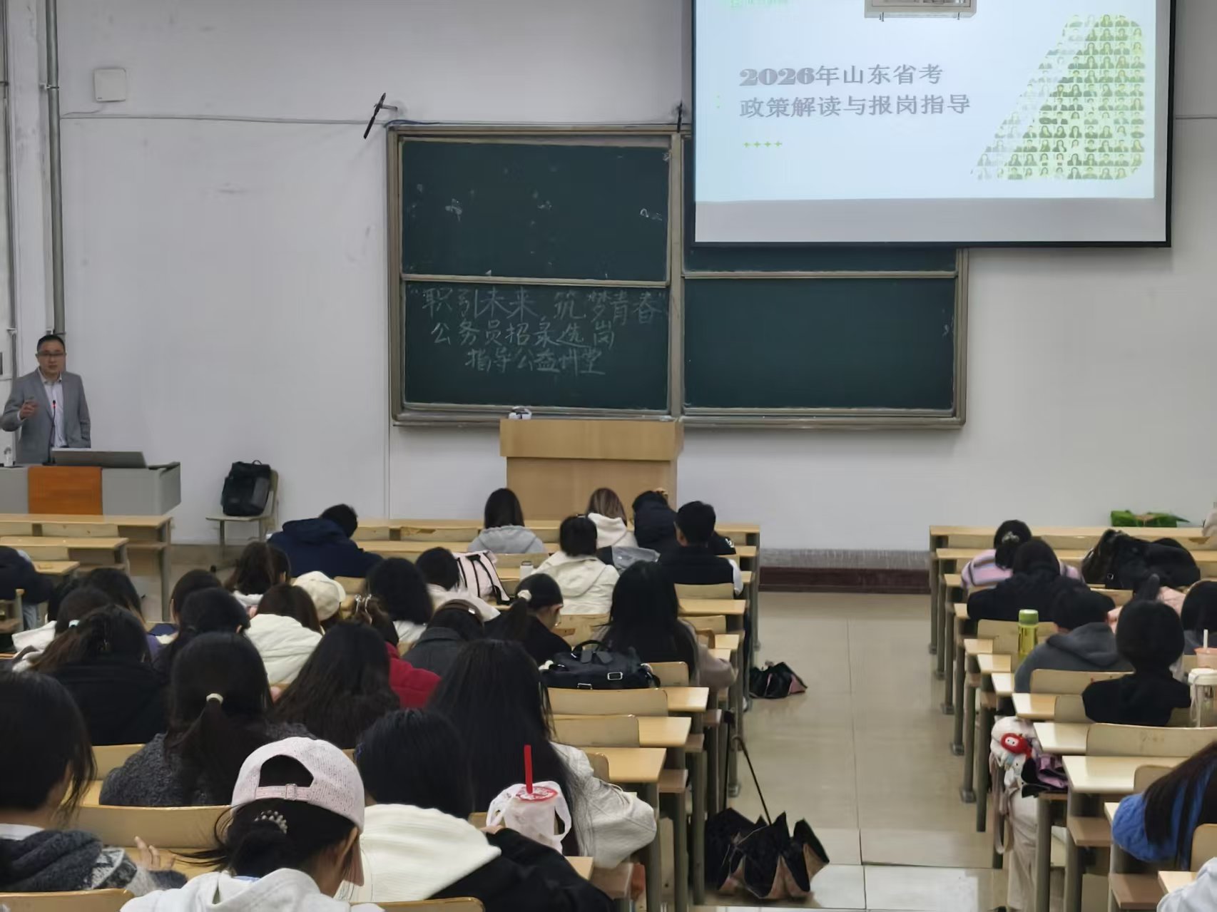 本次讲堂紧扣2026年山东省考政策风向,成公教育主讲人从公务员招录时间节点、岗位适配性、报考策略等方面展开专业讲解,结合外语类专业特点,梳理了外事部门、综合行政岗位等对口招录信息,为学子解析岗位限制条件中的专业匹配细节,指导大家结合自身条件科学筛选岗位。同时,主讲人结合历年报录比数据,就笔试备考节奏、行测申论提分技巧等实用内容给出专业建议。