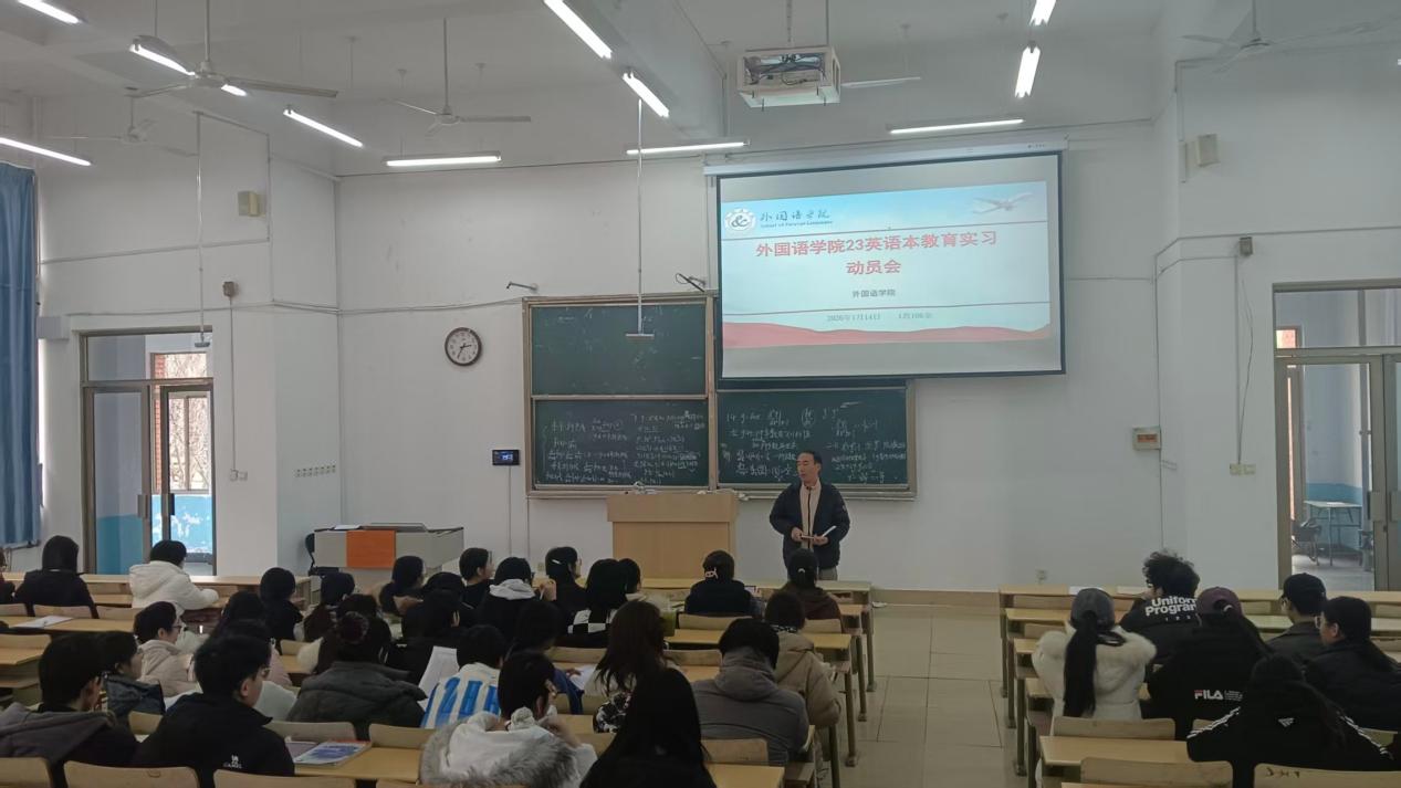 为落实英语专业人才培养方案要求,帮助2023级学生顺利开启教育实习(支教)实践,夯实教学技能与职业素养,1月4日下午,我院在1-106教室召开2023级英语专业本科生教育实习(支教)动员会。会议由田纯广副院长主持,实践教研室主任苏玉鑫、23级英语专业78名本科生及指导教师代表参会,为即将启程的实习(支教)工作凝聚共识、明确方向。
